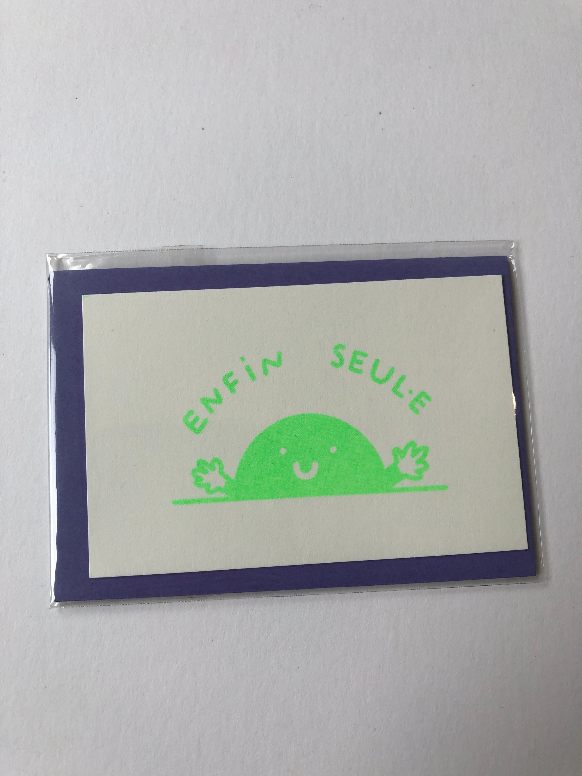 Mini carte vert fluo type carte de visite, imprimée en risographie à Bruxelles.
